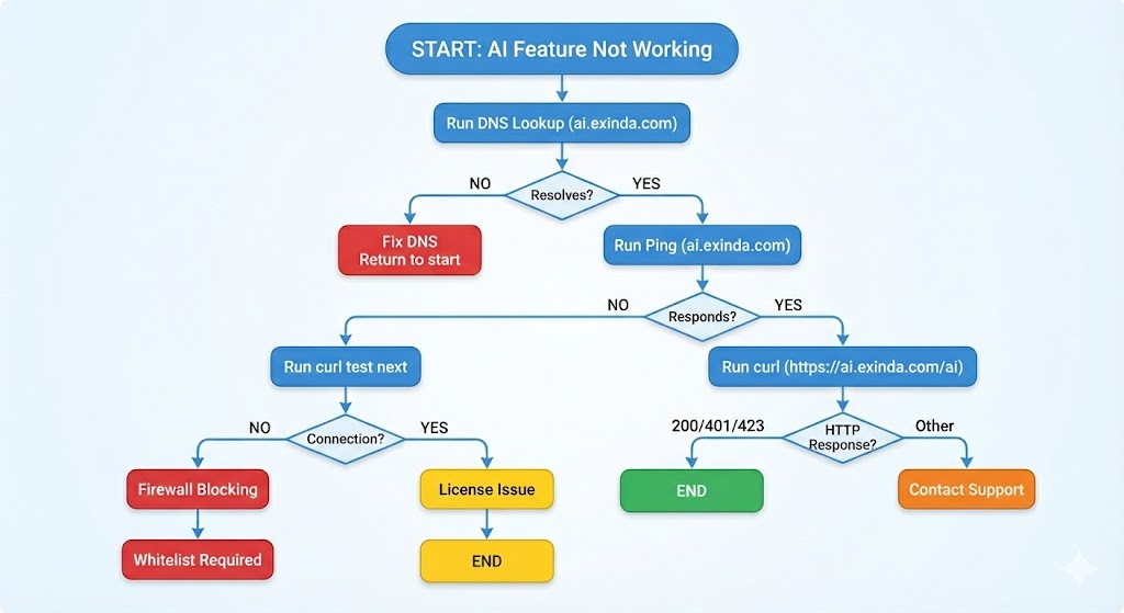This guide helps verify whether an Exinda appliance can connect to the Exinda AI service (ai.exinda.com) when AI features are missing or not responding.