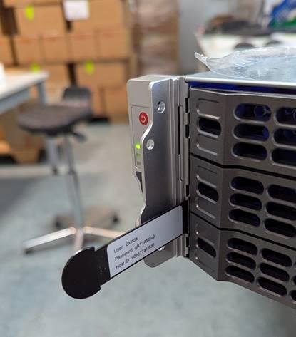 On the front left panel of the Exinda 10065 and 12065, there is a small pull-out slider tag - similar to the service tag card found on Dell servers.